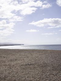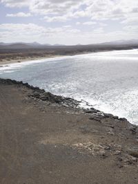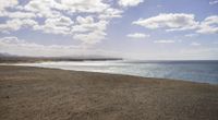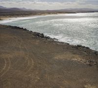 A top down view of the coastal landscape of Fuerteventura, Spain, with its rugged cliffs, sandy beach, and beige soil. The lake, ocean, and clouds in the horizon provide a natural environment with a variety of surfaces including asphalt, concrete, wood floor, tile, and gravel.