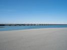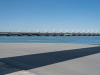 The sun rises over the ocean horizon and the shoreline of Holland, revealing a symmetrical landscape full of fluid water resources, wind turbines, bridges, roads, and trees. A clear sky and hard shadows create a peaceful backdrop for this natural environment, while asphalt and composite materials provide a backdrop of urban design.