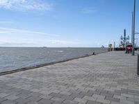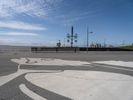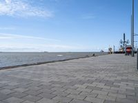 A view of Bremerhafen, Germany on a calm and sunny day. The urban design includes asphalt roads with a street light, a public plaza with a composite material walkway, a pier and a lake with a grassy jetty. The horizon is made up of a clear sky with a few cumulus clouds.