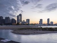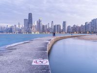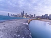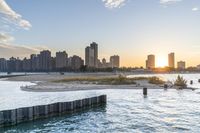 The sun rises over the Chicago skyline, shining light on the harbor and coastal area. The city's beach, jetty, path, pier, and river all combine to form a peaceful, recreational urban area with a skyline of skyscrapers, towers, and a concrete road straight down the beach.