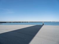 A stunning landscape of the Netherlands featuring a shoreline with a pier, a lake, a wind turbine, a bridge, a channel, a reservoir, a salt evaporation pond, trees, and a hard shadow of a roof on a road surface with a tar composite material, all under an azure sky and a horizon of clouds.