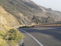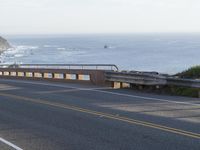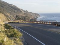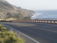 A spectacular view of the Armco barrier along S-curve on the Pacific Coast Highway in Big Sur, California, USA. The dawn sky is illuminated with sunshine and clouds while the landscape is filled with trees, grass and ocean views. The elevated highway winds through the mountainous terrain, creating a low-lying line of infrastructure, vehicles, and coastal nonbuilding structures.