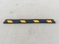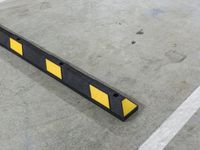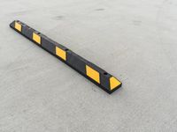 A spirit level tool is used to check the level of a parking lot in Los Angeles, California, USA. The parking lot is made of asphalt and concrete and is marked with yellow lines, a logo, and parking barriers that are parallel to the road surface. The floor is elevated with a tape measure and symbolizes the infrastructure of the public space.