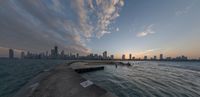 A stunning view of the modern city skyline of Chicago, USA against the coastal shore and an ocean of water, sand, and sunshine at dawn.