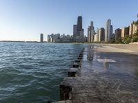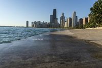 A stunning view of the urban skyline and modern architecture in downtown Chicago, Illinois, USA with the city's iconic skyscrapers, roadways, and the beautiful shoreline along Lake Michigan.