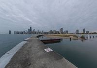 The sky illuminated by the rising sun reflects off the coastal waters of Lake Michigan at the pier in Chicago, USA, offering a stunning view of the city's modern architecture and iconic skyline.
