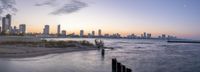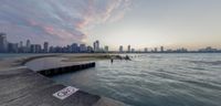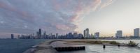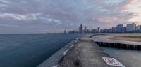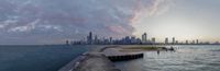 The sun rises above the horizon of the metropolitan area of Chicago, Illinois, USA. A concrete street leads to a pier and a jetty, where a recreational path meets the natural shore of the coastal ocean. Skyscrapers, open spaces, and a harbor create the cityscape of the metropolis.