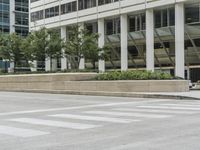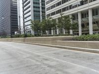 A view of the modern architecture, urban design, and infrastructure of a metropolitan area in Chicago, Illinois. The view shows an Armco barrier, lane, plaza, condominium, high-rise, residential area, public space, and a tree-lined thoroughfare.