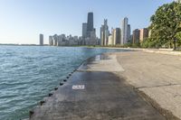 The city of Chicago, Illinois, USA, at dawn, with its modern architecture, waterfront, harbor, recreational areas, and natural environment in the backdrop of a clear blue sky, illuminated by the morning sunlight.