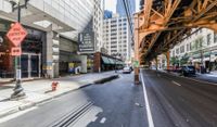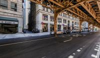 An urban underpass in Chicago, Illinois, USA, casts a hard shadow down a straight asphalt road during the day.