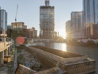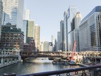The stunning cityscape of Chicago, Illinois, USA, reflects off the calm waters of the river on a sunny day. The high-rise buildings, bridges, and skyscrapers create a beautiful metropolitan area with open spaces and clear skies.