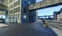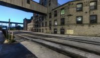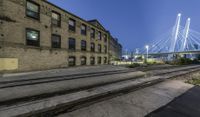 The classic architecture and urban profile of Chicago, Illinois is illuminated by artificial light on a clear night. Railroad tracks, asphalt roads, and open concrete spaces make up the city's industrial art district.