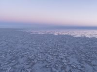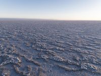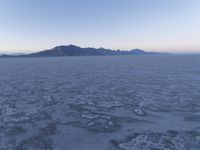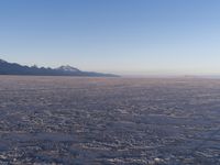 A clear winter sky shines down on the frozen Salt Lake in the state of Utah, USA. The rugged mountains of the area create a majestic landscape, stretching across the icy ocean and open plain below.