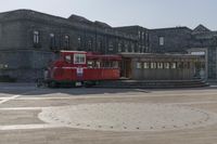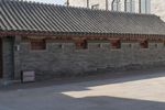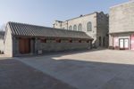 A classic brick structure with a cobble stone driveway, located in a residential neighborhood in Beijing, China. The open space features an estate with a locomotive and vehicles parked in a row, looking straight down the road.