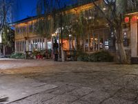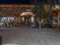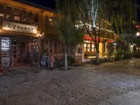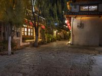 The yellow tree and cobble stone walkway of a classic Chinese estate in Lijiang, Yunnan, China, is illuminated by artificial light in the break of day. The architecture of the mixed-use residential area, including a hotel, cafe, restaurant, public space, and place of worship, captures the beauty and charm of the urban design in a neighborhood suburb. Tourists and locals alike enjoy the urban landscape on their leisurely walk through this old town, a popular attraction in Shangri-La.