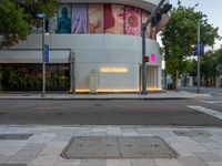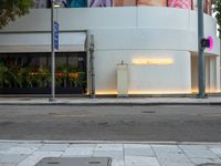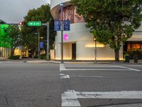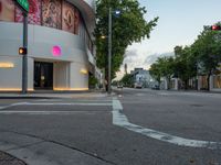 The sun rises over Miami Beach, USA, as the city comes to life with the morning traffic light and store fronts along the asphalt road.