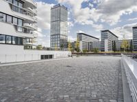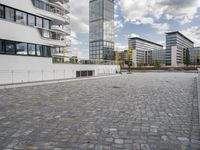 A snapshot of modern architecture, trees, and cobblestone roads in the metropolitan area of Berlin, Germany on a sunny day.