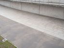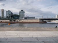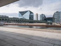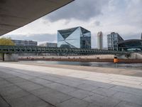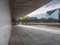 A straight-down-the-road profile view of Berlin, Germany, showcases the contrast between the modern architecture of the city and its clear-blue sky. The surface of the road, the bridge, and the underpass add a unique urban design to the cityscape.