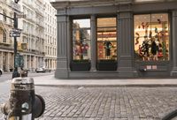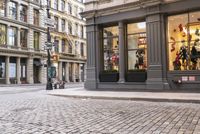 The dawn light illuminates the mix of buildings and storefronts in Manhattan's Soho neighborhood, USA. This urban landscape of classic architecture, cobblestone roads, public spaces and pedestrian flooring is a popular tourist attraction and a defining feature of this human settlement.