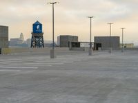 A view of a city skyline in the early morning, with the structure and infrastructure illuminated by the street lights and the sky a mix of clouds and dawn. The roads are a combination of asphalt, concrete and parking lot surfaces, creating a unique urban landscape.