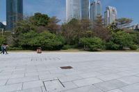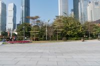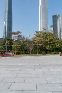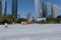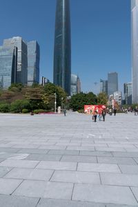 A beautiful clear sky day reveals the sprawling cityscape of Guangzhou in Guangdong, China, with its asphalt paver surfaces and open urban spaces.