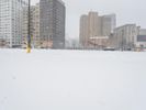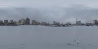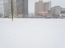A residential neighborhood in Detroit, USA is visible on a freezing winter day, with a downtown skyline and open space in the background. Snow and ice blanket the urban surface.