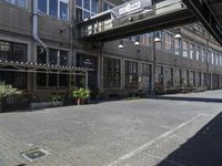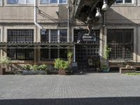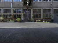 A Land Rover Defender parked in front of a classic architecture building in an art district in Berlin, Europe. The cobblestone street is lined with benches, cafe tables, and a garden of botany.