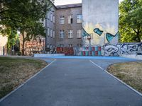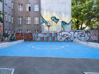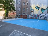 An urban open space with a basketball court, graffiti wall and residential area in Berlin, Germany. The road surface is asphalt and the architecture consists of brick and tar. The view from the building's window reveals a courtyard with grass, trees and colorful paint on the facade of the property.