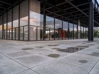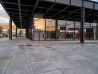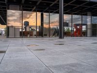 At the break of day, the mixed-use high-rise headquarters in Berlin is illuminated by the sunlight, with its composite material facade, aluminium beam, tile flooring and transparent windows. A vehicle parked in the courtyard provides a contrast to the urban design, with vegetation, a concrete curb and asphalt road surface in the background.