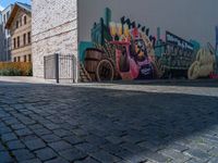 A cobblestone street in Berlin, Germany, littered with graffiti on the walls. The hard shadow of the road creates an urban design as people drive by and eat out at the restaurant entry.