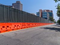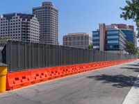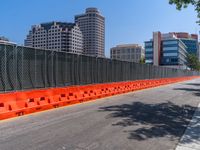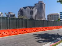 A stunning view of a bustling city in California, with clear skies and modern architecture. The business district is filled with office buildings and wide roads, showcasing the urban design and vibrant city life.