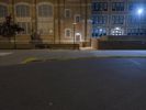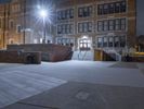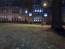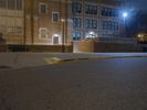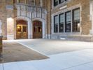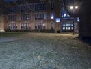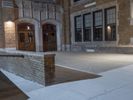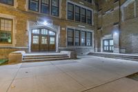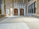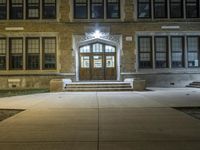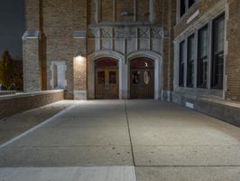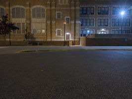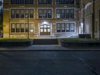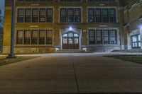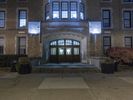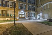 The classic architecture and symmetrical brickwork of a residential building in downtown Detroit, Michigan, USA illuminated by artificial light on a dramatic evening. A walkway, parking lot, and open public space with grass surface and a few trees can be seen in the foreground.