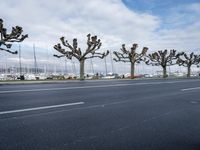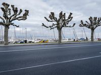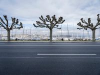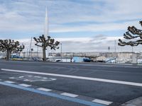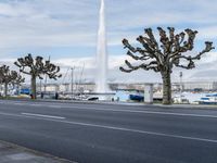 The city of Geneva, Switzerland, is viewed from the lakeside, with a winding road of asphalt leading towards a harbor featuring a jetty, pier, and fountain in the foreground, providing a classic architectural profile. The sunny day is complemented by a clear sky and a lake in the background.
