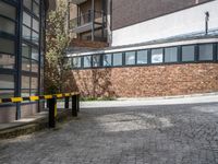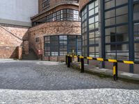A view of a typical German hinterhof (alley-way) in Europe, showcasing the cobble stone driveway, brick walls, and various elements of the city such as the bicycle, manhole cover, gas fixture, and more.