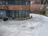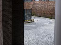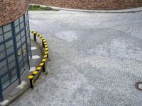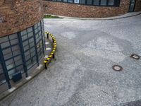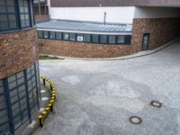 A view of a residential area in Germany, with a mix of classic architecture and modern infrastructure. The cobblestone alley-ways, brick walls, and curving roads are framed by tall buildings and a lush courtyard with grass, trees, and asphalt. A bicycle parked in the foreground adds a touch of city life to the scene.