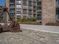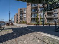 This stunning photo captures the essence of city life in Germany. The modern architecture of a residential area is showcased, with a clear sky providing a beautiful backdrop. The image features a road made of cobblestone and asphalt, adding to the charm of the urban design. A storage facility, or warehouse, can be seen in the foreground, casting a hard shadow on the surface. The photo perfectly encapsulates the urban lifestyle and architectural beauty of Germany.