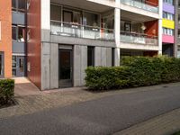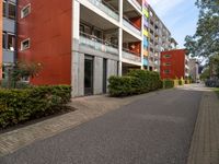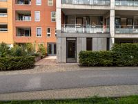 A view of a residential area in the Netherlands, with modern architecture, vegetation, a road surface, curb, window, door, building facade, and groundcover in the foreground, and an office building in the background. The scene is illuminated by tints and shades of the sun, and the sky is filled with clouds.