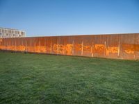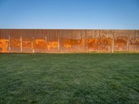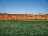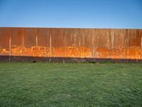 A metal graffiti wall in a park in Berlin, Germany, with clear sky and a hard shadow of a nearby river in the break of day. The greenery and urban design of the city make it an ideal destination for recreation and art.