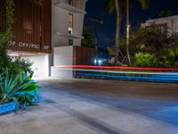 A concrete street in the city illuminated by artificial light is home to a busy nightlife, with cars creating long streaks of light and motion blur as they pass by.