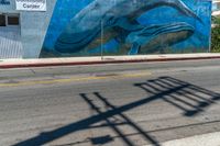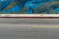 A vibrant urban scene in the art district of Los Angeles. Colorful graffiti wall on a road with clear skies and a profile of a person walking by.