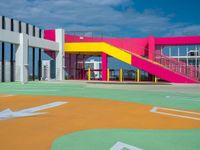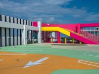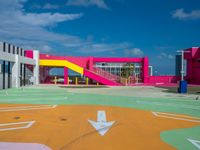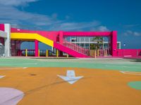 A view of the urban art district of Miami Beach, Florida, USA, with a concrete parking lot and an open space down the road, as clouds drift by on a sunny day.