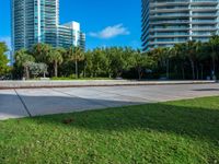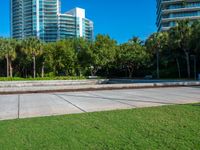 A concrete street in Miami Beach, Florida is illuminated by a hard shadow, providing a glimpse of urban life in the USA.
