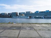 A sunny day reveals the modern architecture and urban design of the city, with a pier and boat on the river, lake, and harbor. The high-rise buildings, vegetation, and street furniture provide a view of the coastal cityscape against a clear sky.