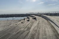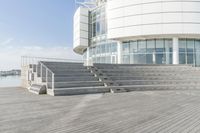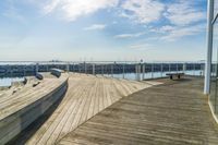 The view of the metropolitan area of Milwaukee, WI, USA, is seen from the boardwalk, with its architectural skyline, coastal nature, and recreational pathways providing a connection between the road, the river, the harbor and the ocean. The clear sky above highlights the various building facades, handrails, guard rails, and fixed links, while the hardwood and steel flooring, staircases and roofs provide a low profile for the jetty, breakwater and pier.