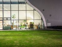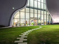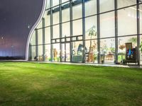 A cityscape of Taichung, Taiwan during break of day, with modern architecture, artificial light, asphalt road, concrete surface, grass surface, open space, plaza, shop storefronts, and street lights reflecting in the clear sky.
