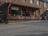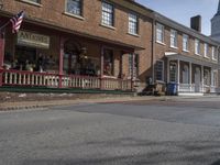 A picturesque view of a cityscape in Tennessee, USA. The image showcases a charming brick and stone building with an antique facade. The clear sky and sunny weather add to the urban design. The road surface and paver road lead to a suburban residential area with beautiful vegetation. The storefront windows and flags add to the vibrant city life.