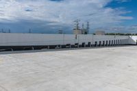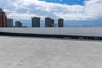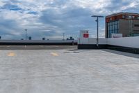 A view of the urban landscape in Toronto, Canada. The city's concrete surfaces and open spaces are accentuated by the clouds on a sunny day. The parking deck and parking garage provide convenience for city dwellers.