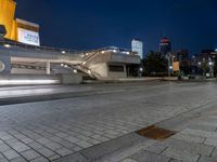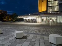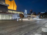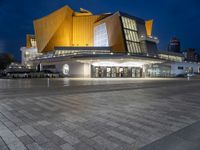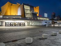 A view of Berlin's Hinterhof, a mixed-use district of high-rises, offices, opera, museums, and a transport hub. Automotive lighting, tires, asphalt, clouds, electricity, and street lights illuminate the night, while a tree and vegetation add tints and shades to the modern cityscape.