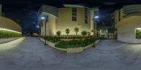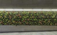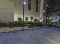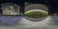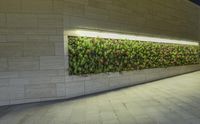 A view of the modern architecture of Los Angeles, California, USA, at night, featuring a sandstone wall, green wall, vertical garden, and walkway illuminated by artificial light, with a woody plant, hedge, shrub, vegetation, flower, and road surface in the foreground.
