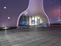 A view of the vibrant cityscape of Taichung, Republic of China. The modern architecture and shop fronts are illuminated by the artificial light of the night, surrounded by a clear sky and a grass surface below.
